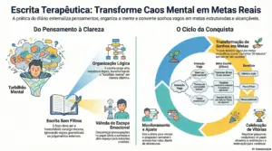 Descubra o poder transformador da escrita terapêutica! Organize sua mente, defina metas claras e viva a vida plena que você sempre sonhou. Comece hoje!