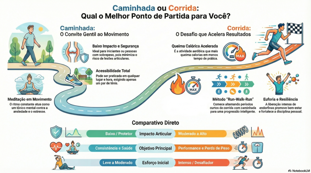 Descubra qual atividade física é a ideal para você começar a se exercitar e transformar sua vida hoje mesmo! Caminhada ou corrida? A resposta que você precisa está aqui.